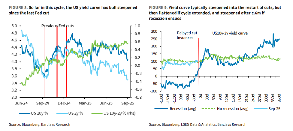 降息重启后,收益率曲线走势呈现分化。在无衰退情形下,曲线在降息后数月内温和走陡,随后转为平坦化。在衰退情形下,初始陡峭化后出现熊市平坦化,约6个月后随着经济复苏转为熊市陡峭化。
