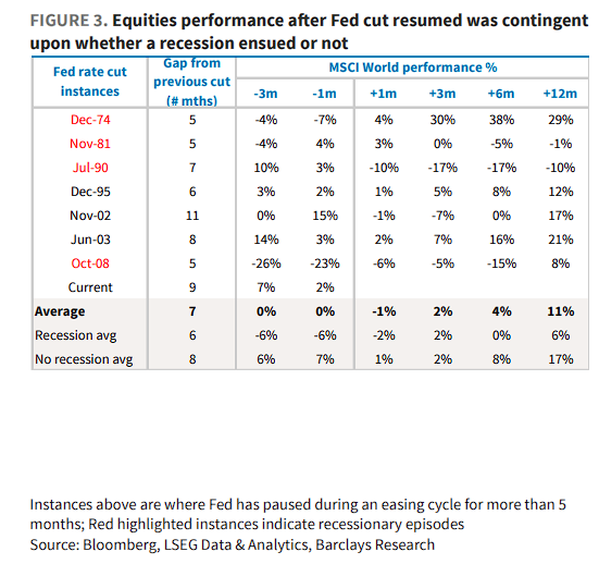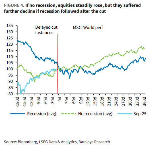 据巴克莱统计,过去五十年美联储在显著暂停后重启降息的七个主要实例中,1974年12月、1981年11月、1990年7月和2008年10月四次降息后发生衰退,而1995年12月、2002年11月和2003年6月三次降息后经济持续扩张。