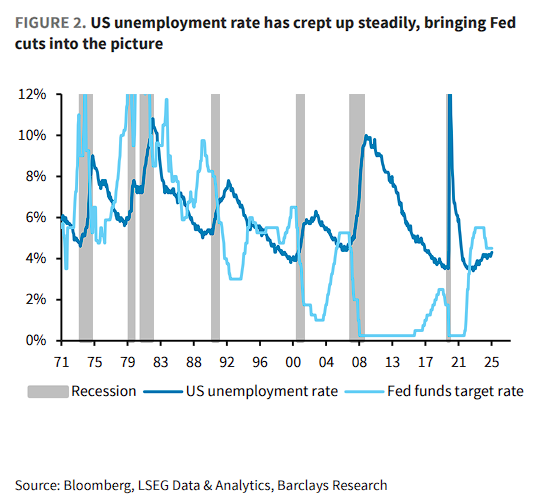 目前美国失业率已从低位稳步攀升至4.3%,这正是市场预期美联储重启降息的主要驱动因素。巴克莱经济学家预计,随着劳动力市场显著放缓,美联储可能将联邦基金利率从当前水平降至2026年底的3.0%。