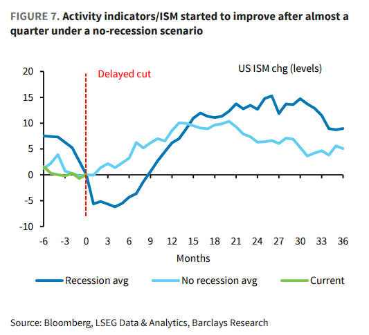 经济活动指标同样呈现类似模式。ISM制造业指数在无衰退情形下,通常在降息后约一个季度开始改善。但在衰退情形下,该指数持续下滑数个季度才见底回升。