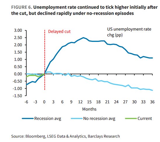 巴克莱强调,失业率成为区分两种情形(经济衰退或经济扩张)的关键指标。历史数据表明,当衰退发生时,失业率在降息后持续上升近一年;而经济持续扩张时,失业率仅小幅上升后在几个季度内开始下降。目前美国失业率已稳步攀升,这正是促使美联储考虑降息的关键因素。