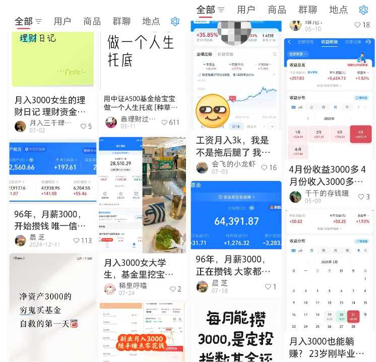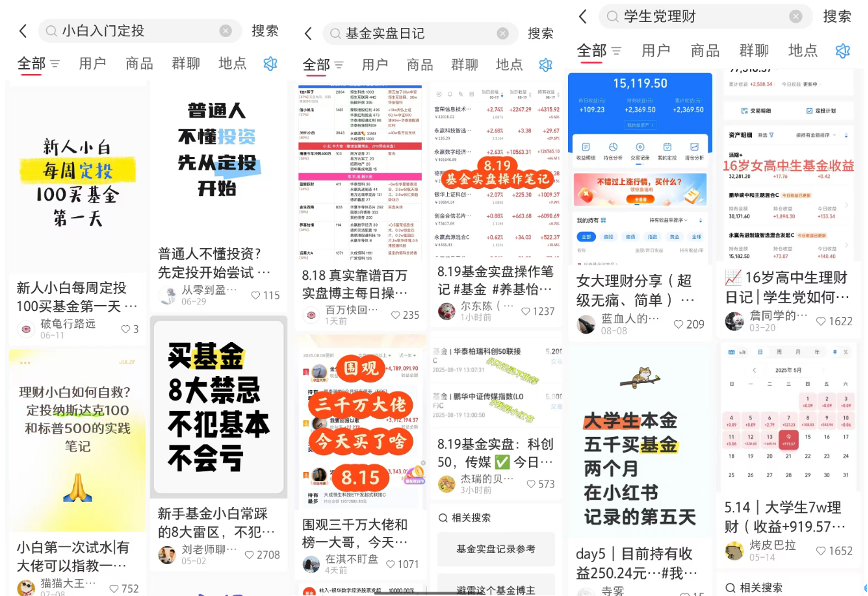 在社交媒体平台上,基金不再是单调乏味的金融产品,而成为“可记录、可展示、可交流”的生活内容载体。社交平台搜索框内,诸如“基金实盘日记”“学生党理财”“小白入门定投”等关键词,关联出海量内容,而基金投资也被赋予了更多社交属性与情绪价值。