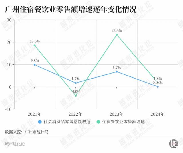 对于广州而言,餐饮对消费的带动尤为显著。从过去几年来看,广州消费增长经历了大起大落,而餐饮则充当了消费变化的"晴雨表"。在消费增长较快的年份,住宿餐饮业零售额也经历了大幅增长,反之亦然。