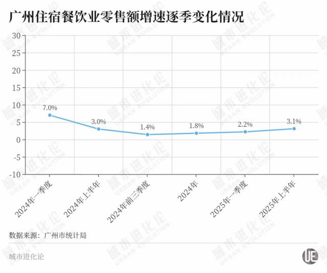 相比之下,广州餐饮业增势更快一步实现 U 型反转,到今年上半年,住宿餐饮业零售额实现 3.1% 的增速,领先一线城市,呈现出更强的韧性。